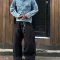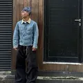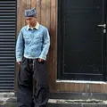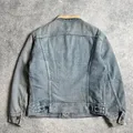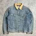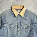 This vintage Lee Storm Rider denim jacket features naturally faded blue denim that showcases authentic wear and character over time. The contrasting tan corduroy collar adds a classic workwear touch, complemented by metal buttons and dual chest flap pockets.