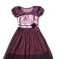 Dress Pesta bergaya Klasik/Vintage. Gaun ini memiliki detail tangan balon pendek yang khas dan potongan pinggang tinggi. Perpaduan material Satin mengkilap di bustier berwarna pink gelap dan rok lebar berlapis Tulle berwarna ungu tua memberikan kesan anggun ala tempo dulu. Dipermanis dengan pita satin hitam dan aplikasi bunga yang manis.