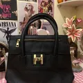 black faux leather tote bag with a gold-tone H-shaped clasp