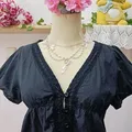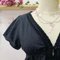 Atasan crop babydoll dengan detail lace dan warna hitam sedikit turun (80%). Tetap cantik untuk gaya coquette dark, harajuku, soft gothic lolita, atau y2k grunge.