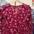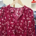 Lengan: Lengan panjang atau tiga perempat yang bervolume (puffy), dengan detail kerutan (ruffles) di bagian lengan.