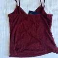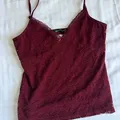 Wine Colored, V-neck lace tank with lace and bow detailing, seams under the bust, and adjustable shoulder straps