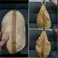 Sz 30x26cm. Kulitnya spt tekstur kulit ular. Minus agak kotor di furing, ada kikis sedikit di handle tapi yg sisi bawah jd kalau dipakai tidak kelihatan minusnya. Cakep. Warna kuning kecoklatan.