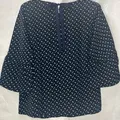 CONNEXION Blouse Navy Motif Tangan 3/4 lebar cantik. Pengait dengan pita. Size: M Bahan: Polyester flowy adem LD: 94 cm Pjg: 60 cm Warna: Navy motif Kondisi: - No minus, masih sangat bagus. - Koleksi pribadi, jarang dipakai.