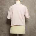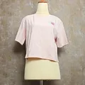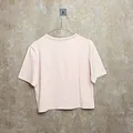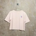 Kaos crop top warna pink pastel dengan tampilan simpel dan manis. Ada detail patch kecil lucu di bagian dada, bikin look clean tapi tetap ada aksen. Cocok untuk gaya kasual sehari-hari.
