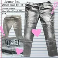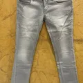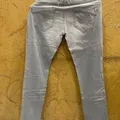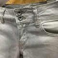 Celana panjang berbahan denim berwarna abu-abu muda. Celana ini memiliki dua kancing pada bagian pinggang, kantong depan model klasik, serta cutting lurus (straight fit). Warna denim tampak memiliki efek washed yang memberi kesan sedikit pudar dan kasual.