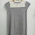 Tunik/dress kasual dengan motif garis horizontal navy putih, dilengkapi detail lace (renda) pada bagian dada untuk sentuhan feminin. Model simpel namun tetap chic, cocok dipakai sehari-hari maupun acara santai.