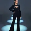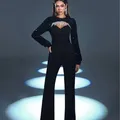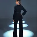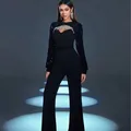 stylish black jumpsuit. The outfit has long, sequined sleeves that add a touch of glamour and sparkle. The bodice features a structured sweetheart neckline with a sheer panel embellished with crystal or rhinestone detailing, giving it an elegant and sophisticated accent.