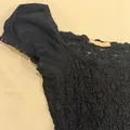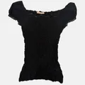 Fitted and stretchy black top featuring a textured lace fabric, square neckline, and dainty puff sleeves. Size P: 46 cm L: 27 cm