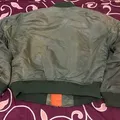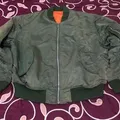 green bomber jaket with a worn and faded look to it, still in good condition