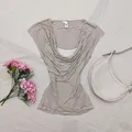 Bahan kaos lembut, nyaman dipakai harian maupun untuk styling aesthetic look. Cocok dipadukan dengan rok panjang, celana cutbray, atau layering inner untuk vibes Y2K hingga morikei.