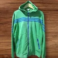 Karakteristik Produk Merek: Adidas Jenis Pakaian: Hoodie full-zip Warna: Hijau limau dengan garis dan Zipper embose biru Gaya: model vintage Fitur: Tudung kepala (hoodie) dan saku zipper di bagian depan bawah Size : L LD 118 - 120 P 70