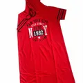 Hoodie dress warna merah dengan desain casual streetwear. Dilengkapi hoodie dengan tali serut dan motif tulisan “New York 1982” di bagian depan. cocok untuk daily wear atau santai.