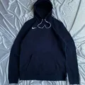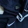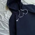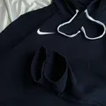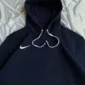 Hoodie Nike like new yang ditampilkan dalam gambar kemungkinan besar adalah model Nike Solo Swoosh Men’s Fleece Pullover Hoodie. Hoodie berwarna navy ini memiliki desain minimalis dengan logo Swoosh putih kecil yang dibordir di dada kiri, serta tali serut putih yang kontras.