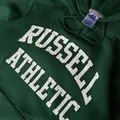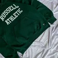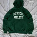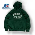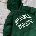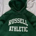 Hoodie Russell Athletic Dri-Power (model 695HBM) berwarna hijau dengan logo grafis “RUSSELL ATHLETIC” berwarna putih. Hoodie uniseks ini terkenal karena kenyamanan dan daya tahannya.