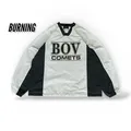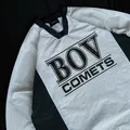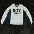 Jaket BURNING pullover V-neck bergaya sporty dengan tulisan “BOV COMETS” di bagian depan, dengan panel warna putih dan hijau tua,