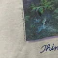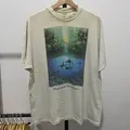 Kaos vintage dengan grafis penuh nuansa alam bertema lautan, menampilkan ilustrasi paus orca (killer whales) yang berenang di lautan biru dengan latar belakang air terjun dan hutan hijau. Dihiasi teks “Think About Tomorrow…” sebagai pesan lingkungan.