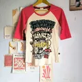 brand Blue Moon Blue Japan motif printing bukan sablon gaya Y2K keren, model lengan 3/4 warna asli putih tulang + merah LD 86-100cm, P 62cm