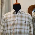 Bahan katun Sim Fit warna hitam kotak kotak Ld : 116Cm Pj : 76Cm kondisi 90% (ada sedikit noda di bagian kerah detail foto slide ke-6)