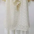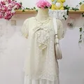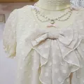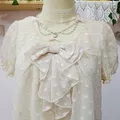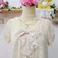 Atasan manis dari LAISSE PASSE, berbahan sifon rubiah berfuring dengan detail pita besar & ruffle depan. Kesan girly dan elegan khas Jepang, cocok untuk gaya coquette, kawaii, lolita soft, mori-kei, dan harajuku.