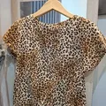 cute leopard print top with short sleeves and a relaxed silhouette. gives effortless chic vibes with a slightly playful touch. easy to pair with skirts or jeans for a simple but standout look.