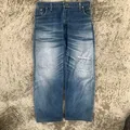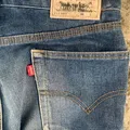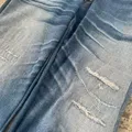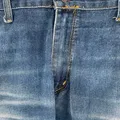 Detail distressed di paha, resleting khas 505, kancing lengkap.