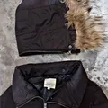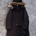 Long Parka tebal warna hitam pekat, panjang sampai paha-lutut, double zipper.Bulu di tudung (kupluk) lembut dan bisa dilepas (cek detail kancing)