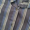 blouse wanita dengan motif garis vertikal warna biru navy, biru tua, dan putih. looks very slim and classic! lengan pendek model puffnya bikin lebih feminin. cocok for something casual to semi-formal.