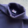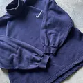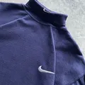 Dark navy color, embroidered swoosh on chest and collar, soft heavy cotton fleece fabric, raglan sleeves with elastic cuffs, boxy relaxed fit.