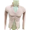 pink long-sleeved ruched v-neck top.