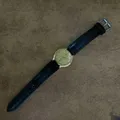 rado jam tangan bergaya klasik atau dress watch dengan dial (pelat jam) berwarna emas dan tali kulit berwarna hitam.