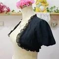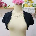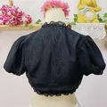 Outer crop berbahan sifon berfuring dengan ruffle cantik di seluruh tepi dan lengan puff. Memberi vibe kawaii—gothic lolita—harajuku sekaligus coquette dark.