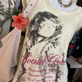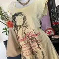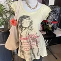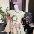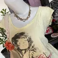 Soft faded yellow tee with vintage graphic print and distressed edges — perfectly worn-in for that true early 2000s look.