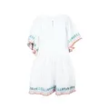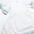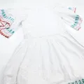 Cotton dress featuring garthered waist, puffed sleeves and scalloped details. Rear teardrop fastening.