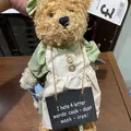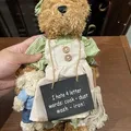 This is a teddy bear wearing a dress and holding a small chalkboard sign. The sign reads: "I hate 4 letter words: cook - dust wash - iron!".