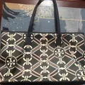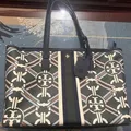A new take on our most-loved Gemini Link Tote Bag. Made of matte coated canvas, with a stripe down the middle, it features an oversized double-link print — a nod to Tory’s twins and her zodiac sign. It’s finished with a zipper for added security.