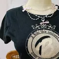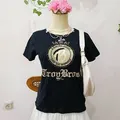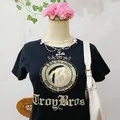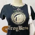 Kaos hitam Troy Bros dengan print gold emblem dan font gothic. Cocok untuk gaya Y2K, grunge, gothic casual, dan harajuku street.
