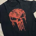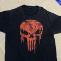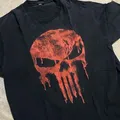 Kaos berwarna hitam pekat dengan desain logo The Punisher berwarna merah pudar di bagian depan, memberi kesan vintage dan grunge yang kuat. Material tampak lembut dan jatuh, cocok buat pecinta gaya lawas atau streetwear bertema Marvel.