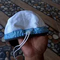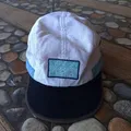 white and blue five-panel hat with black brim and "FASTCO" l