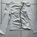 Atasan ini sangat eye-catching berkat tekstur bahannya yang unik dan aksen bling-bling yang memberikan kesan mahal. Cocok banget untuk acara pesta santai atau dinner cantik.