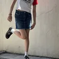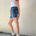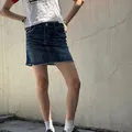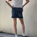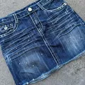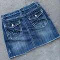 mini but mighty š„ this denim skirt comes with front stud accents, raw hem, and bold back pocket stitching that channels True Religion vibes. pair it with baby tees and tall boots for instant it girl energy.