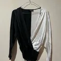 Design: Long sleeves, flattering wrap style, and a secure snap closure at the crotch. The contrast in color and fabric texture makes this top unique.